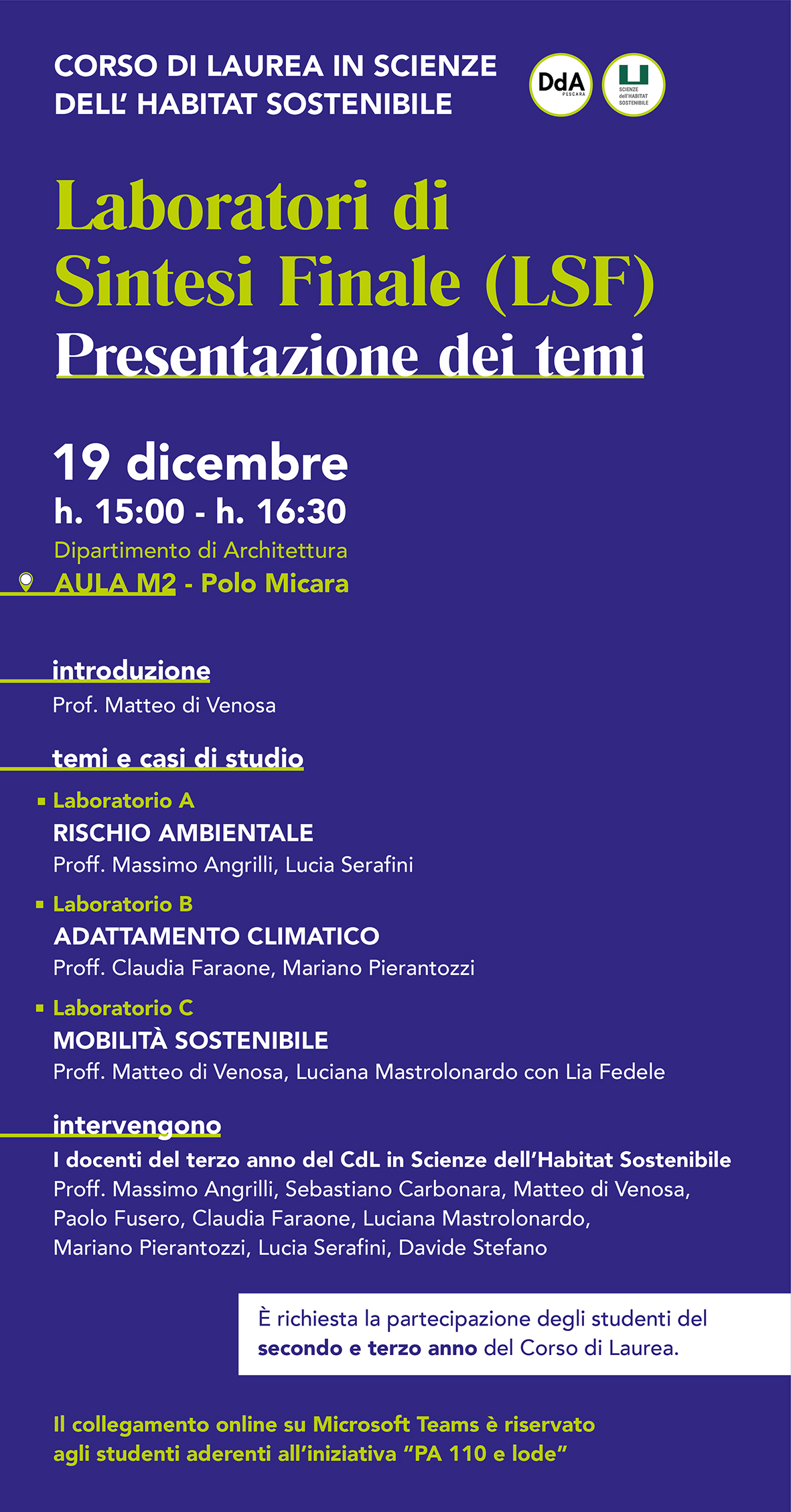 Venerdì 19 dicembre, alle ore 15:00, in aula M2 del Polo Micara, si terrà la presentazione dei temi e degli obiettivi dei Laboratori di Sintesi Finale (LSF) del Corso di Laurea in Scienze dell'Habitat Sostenibile, che saranno attivati nel secondo semestre e frequentati dagli studenti iscritti al terzo anno. L’invito è esteso anche agli studenti del secondo anno: l’incontro rappresenta un’occasione utile per chiarire dubbi sulla fase conclusiva del percorso formativo e per conoscere in anticipo l’impostazione dei Laboratori.