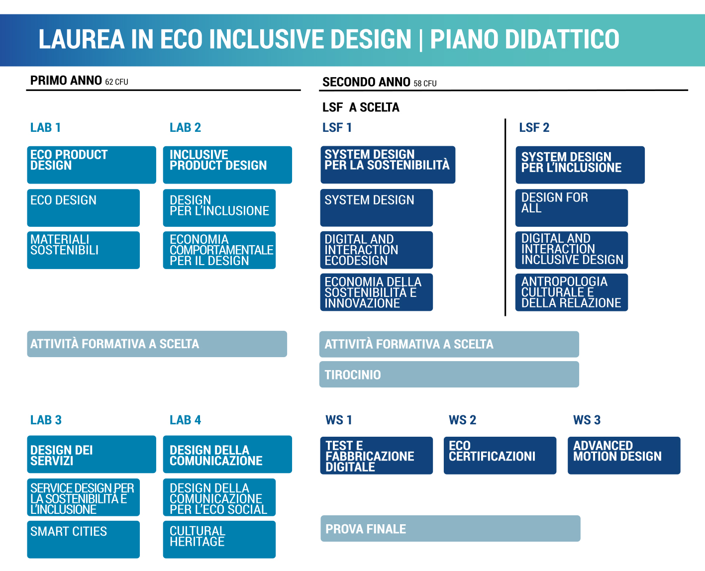 Primo anno | 4 laboratori interdisciplinari di progetto con due moduli integrati in Eco Product design, Inclusive Product design, Design dei servizi, Design della comunicazione.