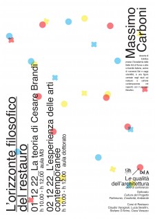 1_L’ORIZZONTE FILOSOFICO DEL RESTAURO. La teoria di Cesare BrandiPolo di Pescara, aula M3, 1 dicembre 2022, h. 10.00-12.00 2_L’ORIZZONTE FILOSOFICO DEL RESTAURO. L’esperienza delle arti contemporaneePolo di Pescara, Dipartimento di Architettura, aula Dottorato, 2 dicembre 2022, h. 10.00-12.00