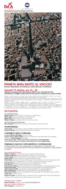 Giovedì 19 ottobre, presso la sede del Centro Ricerca Architettura del polo universitario di Pescara, verrà svolto un seminario di ascolto e di discussione pubblica aperto a tutti gli studenti e ai docenti d’Ateneo. Il seminario vuole costituire un primo momento di incontro con 'il pianeta Iran", in occasione dell’organizzazione della missione di visita nel paese, su invito dell’Università di Yazd, e del Dipartimento di Arte e Architettura, cui partecipano rappresentanti di diversi dipartimenti di ateneo. L’incontro si snoda attraverso immagini, video e testimonianze dirette e recenti di docenti, cooperanti e intellettuali italiani già in contatto col paese, assieme a rappresentanti del mondo accademico e culturale iraniano; all'incontro partecipano anche colleghi di altre università italiane che hanno già realizzato accordi ed esperienze di cooperazione con il paese. Al termine dell’incontro, oltre al programma della visita in Iran, saranno illustrati i contenuti dell’Accordo di cooperazione in corso di redazione tra i due Atenei e la bozza della Convenzione internazionale di cooperazione tra il Dipartimento di Architettura di Pescara e il Dipartimento di Arte e Architettura di Yazd.
