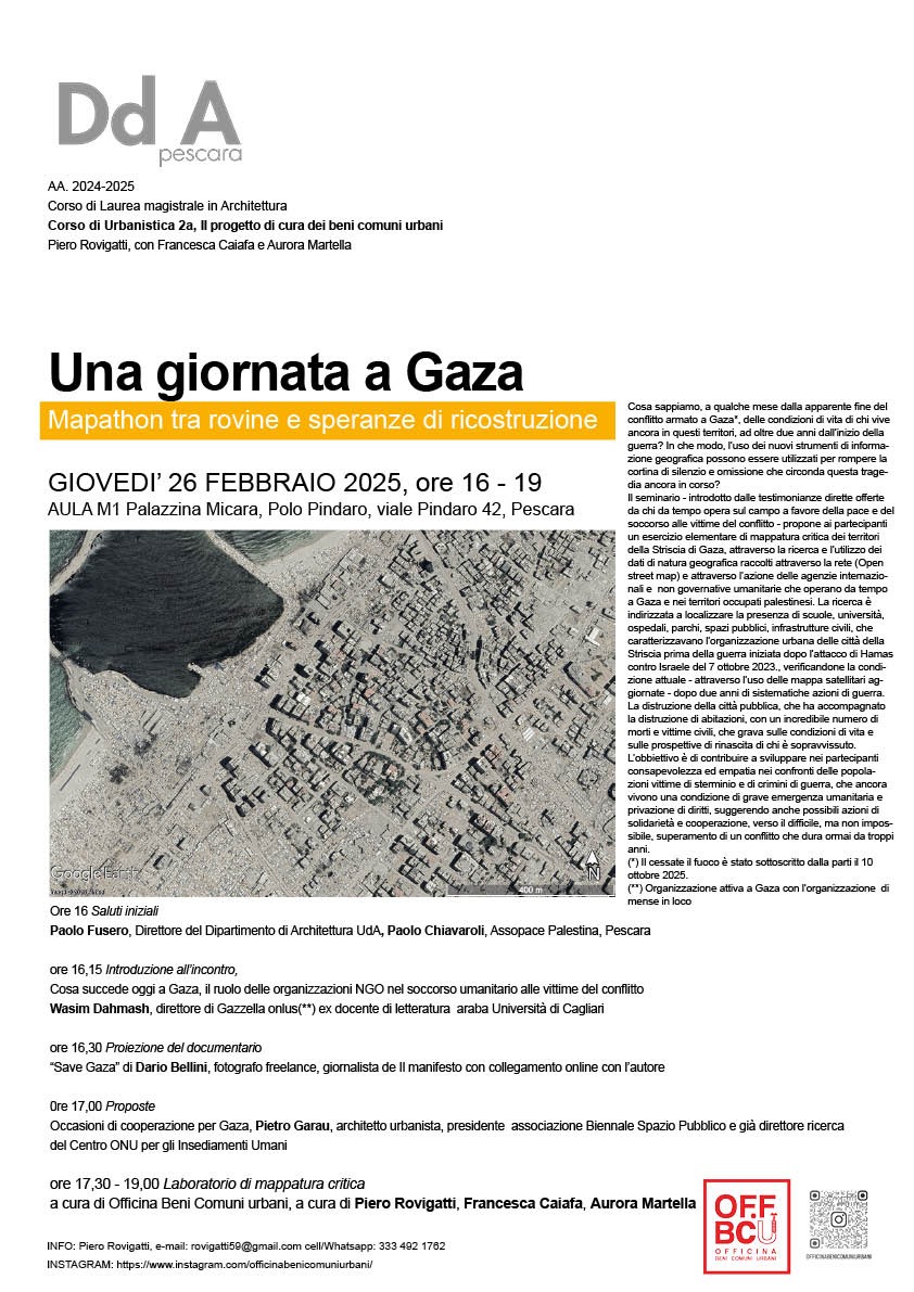 Il seminario - introdotto dalle testimonianze dirette offerte da chi da tempo opera sul campo a favore della pace e del soccorso alle vittime del conflitto - propone ai partecipanti un esercizio elementare di mappatura critica dei territori della Striscia di Gaza, attraverso la ricerca e l’utilizzo dei dati di natura geografica raccolti attraverso la rete (Open street map) e attraverso l’azione delle agenzie internazionali e non governative umanitarie che operano da tempo a Gaza e nei territori occupati palestinesi. La ricerca è indirizzata a localizzare la presenza di scuole, università, ospedali, parchi, spazi pubblici, infrastrutture civili, che caratterizzavano l’organizzazione urbana delle città della Striscia prima della guerra iniziata dopo l’attacco di Hamas contro Israele del 7 ottobre 2023., verificandone la condizione attuale - attraverso l’uso delle mappa satellitari aggiornate - dopo due anni di sistematiche azioni di guerra. La distruzione della città pubblica, che ha accompagnato la distruzione di abitazioni, con un incredibile numero di morti e vittime civili, che grava sulle condizioni di vita e sulle prospettive di rinascita di chi è sopravvissuto.